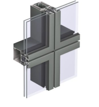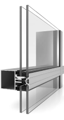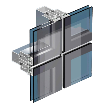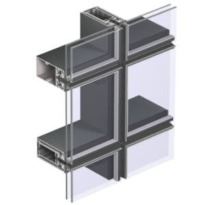 Полуструктурное остекление. Совмещает прочность стоечно-ригельного метода и эстетическую привлекательность структурного. Стеклопакеты крепятся узкими прижимными профилями к несущему каркасу, что минимизирует затемнение поверхности. Благодаря этой системе можно устанавливать крупные стеклянные панели с открывающимися элементами.